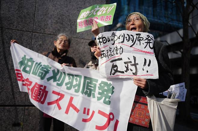 [도쿄=AP/뉴시스] 19일 일본 도쿄 도쿄전력(TEPCO) 본사 앞에서 시위대가 손팻말을 들고 가시와자키·가리와 원전(가시와자키 원전) 6호기 재가동에 반대하는 집회를 열고 있다. 도쿄전력은 2011년 동일본 대지진 사고 이후 15년 만에 가시와자키 원전 6호의 재가동을 추진하고 있다. 2026.01.19.
