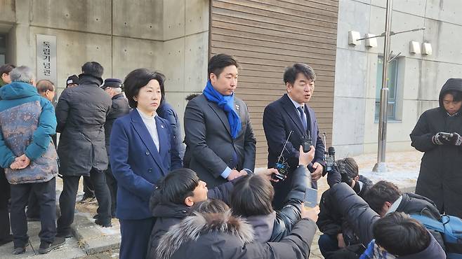| ▲ 독립기념관 이사회에 더불어 민주당 국회 추천 몫으로 참여한 김용만·문진석·송옥주 국회의원은 이날 독립기념관 이사회 직후 기자회견을 통해 입장을 밝혔다. |