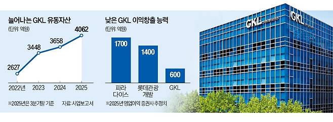 GKL은 서울 강남과 용산, 부산 등 세 곳에서 카지노 영업장을 운영 중이다. 모두 호텔 건물의 일부를 빌려 쓰는 임차 형태다. 경쟁사인 파라다이스, 롯데관광개발, 인스파이어 등이 호텔과 리조트, 수영장, 아레나(공연장) 등의 시설을 자체 보유하고 카지노 고객을 끌어들이고 있는데 이런 구조적 한계 때문에 고객 유치와 실적 면에서 이들 경쟁사에 뒤처지고 있다. GKL의 작년 연간 영업이익 컨센서스(증권사 추정치 평균)는 약 600억원으로, 파라다이스(약 1700억원)와 롯데관광개발(1400억원)의 절반에도 미치지 못한다.
