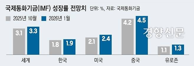 국제통화기금(IMF)이 올해 한국의 경제성장률 전망치를 직전보다 소폭 상향한 1.9%로 제시했다. 미국과 중국 등 주요국의 견조한 성장세를 반영해 세계 경제 성장률 전망치를 높였지만, 인공지능(AI) 열풍에 따른 자산 가격 거품과 금융 부문의 변동성에 대해서는 경고 메시지를 내놨다.