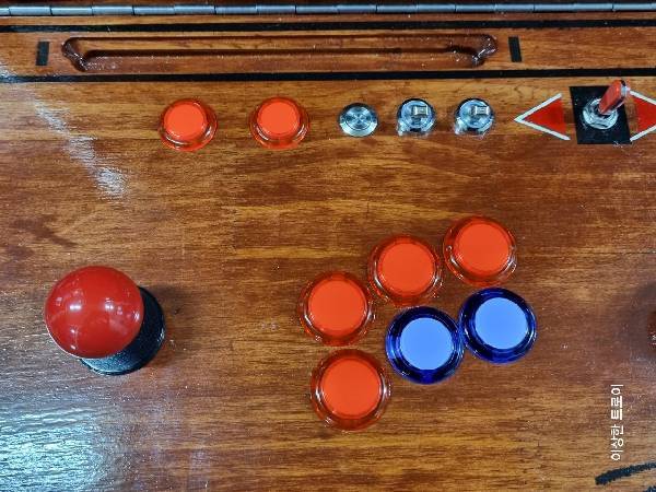 산와 스틱과 버튼으로 배열에 맞춰 깔끔하게 들어간 모습입니다. 그리고 위에 스위치들이 여러개 있는데요, 가운데 스위치가 바로 화면을 회전시키는 장치입니다. 나머지는 음향 조절, 스타트, 코인 같은 버튼들이고요.