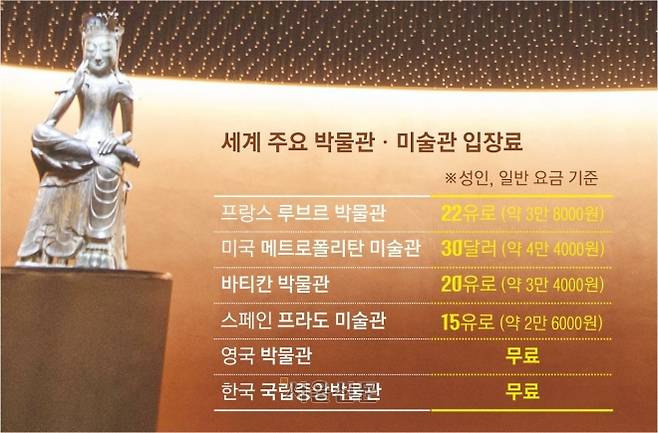 반면 경제적 장벽이 문화 격차를 키우는 결과로 이어지면 안된다는 목소리도 만만치 않다. 과거 중앙박물관에서 근무했던 장상훈 국립민속박물관장은 “메트로폴리탄미술관은 기금·기부금으로 운영되는 반면 한국의 국립박물관들은 100% 세금으로 운영되기 때문에 이미 국민이 입장료를 내는 것이나 다름없다”고 지적했다. 그는 “문화 이해에 대한 너른 품을 가지고 접근했으면 좋겠고, 기부 형식을 좀 더 전면적으로 도입하는 게 유효할 수 있다”고 말했다.