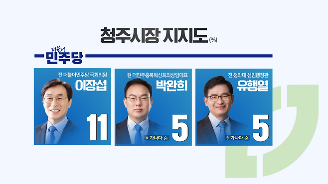 더불어민주당은 이장섭 전 더불어민주당 국회의원 11%, 박완희 현 더민주충북혁신회의상임대표 5%, 유행열 전 청와대 선임행정관 5% 순입니다.