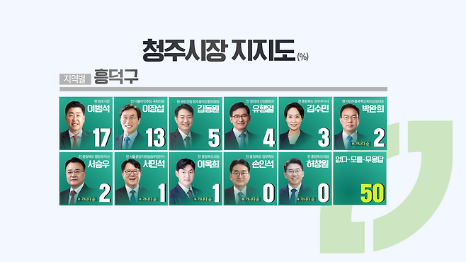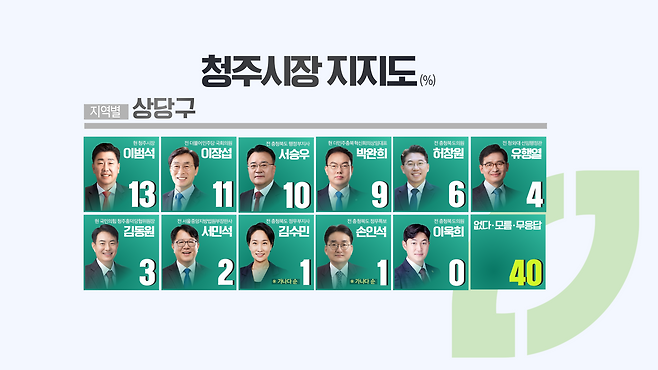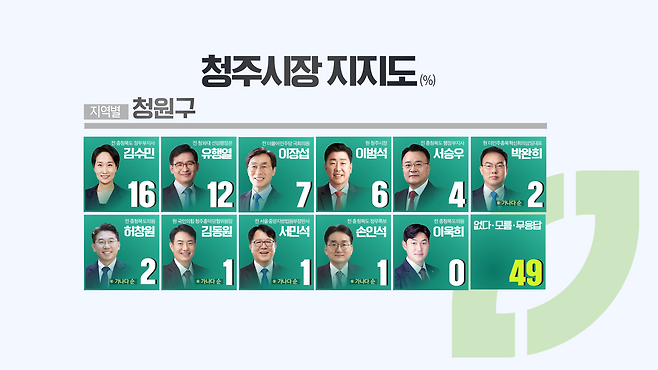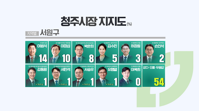 이범석 현 청주시장 17%, 이장섭 전 더불어민주당 국회의원 13%, 김동원 현 국민의힘 청주흥덕당협위원장 5%, 유행열 전 청와대 선임행정관 4% 등의 순으로 상당구와 서원구를 비롯해 지지율 상위권 후보군들이 비슷했습니다.