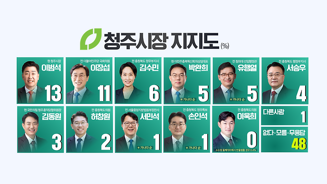 이범석 현 청주시장 13%, 이장섭 전 더불어민주당 국회의원 11%, 서승우 전 충청북도 행정부지사 10%, 박완희 현 더민주충북혁신회의상임대표 9% 등의 순입니다.