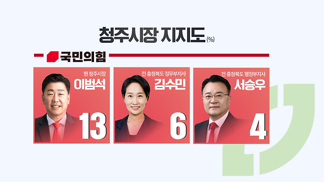 먼저, 국민의힘은 이범석 현 청주시장이 13%, 김수민 전 충청북도 정무부지사가 6%, 서승우 전 충청북도 행정부지사 4% 순입니다.