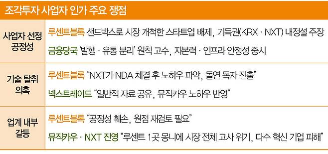 물론 이번 조각투자 장외거래소 예비인가 안건을 루센트블록 입장에서만 볼 수 없다는 시각도 있다. 넥스트레이드 컨소시엄에 참여 중인 1위 사업자 뮤직카우가 “루센트블록의 주장이 시장 전체를 고사시킬 수 있다”며 정면 반박하고 나서면서다.