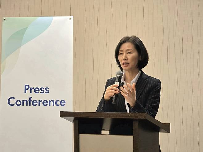 ▲김경아 삼성에피스홀딩스 사장이 지난 14일(현지시간) 미국 샌프란시스코 'JP모건 헬스케어 컨퍼런스' 현장서 기자간담회를 열고 발언하고 있다. 사진=삼성에피스홀딩스