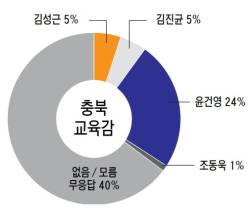 진보성향의 김성근 전 충북도교육청 부교육감과 김진균 전 충북교원단체 총연합회장은 각각 5%의 지지를 얻었다. 이어 조동옥 전 한국산학연협회장 1%였다.