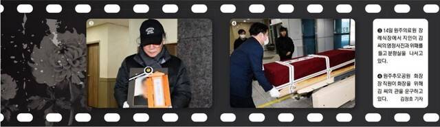 원주추모공원 화장장에 도착하니 리무진과 대형 버스가 줄을 이어 차례를 기다리고 있었다. 김씨는 이날 화장 일정 2회차 가장 마지막 순서에 배정됐다. 앞선 고인들은 흰 장갑을 낀 가족들의 손에 들려 차례대로 옮겨졌다. 화장장엔 유족들의 서글픈 울음소리가 울려 퍼졌다.