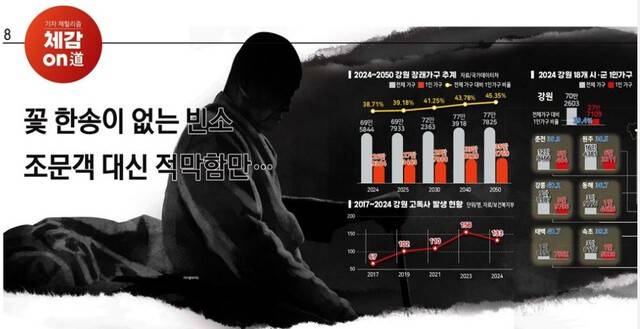 강원도 내 김 씨와 같이 무연고자 공영장례 지원을 받은 건수는 2024년 153건. 이틀에 한번 꼴로 한 생명이 연고자 없는 생을 마감하고 있다. 홀로 생을 마감하는 고독사도 133명 발생했다.