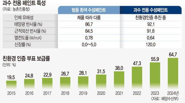 이번 주 예고된 한파는 다년생 과일나무의 가장 큰 적이다. 2021년 1월에 발생한 영하 15도 이하 한파는 전국적으로 축구장 1018개 규모인 727㏊의 과수농가에에 냉해(冷害)를 입혔다. 때문에 농업인들은 겨울이면 과일나무 줄기 단면에 흰색 수성페인트를 바르고는 한다. 냉해 피해 방지를 위한 보온 효과를 노리는 것이다. 대부분은 시판되는 범용성 제품이 쓰인다. 식물에 미치는 유해성이 없다고 보기가 힘들다. 그럼에도 이듬해 수확률 걱정이 앞서다 보니 어쩔 수 없는 일이 됐다.