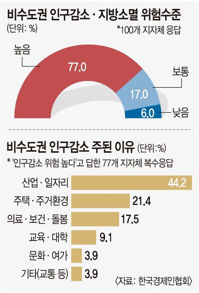 지자체들이 지방소멸 대응 최우선 과제로 지목한 건 ‘기업 유치’(37.5%·복수응답) 였다. ‘주택 보급·거주환경 개선’(19.5%) ‘생활인구 유입 활성화’(12.5%) ‘의료 서비스 강화’(7.5%) 순으로 정책 수요가 높았다. 한경협은 인구감소의 원인과 해법 모두 산업·일자리에 있음을 보여준다고 풀이했다.
