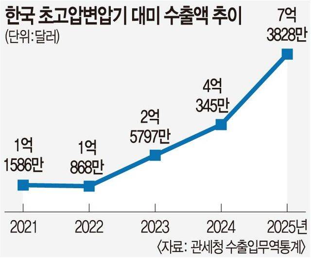 지난해 한국의 초고압 변압기 대미 수출액이 사상 처음으로 1조원을 넘어섰다. 미국의 노후 전력망 교체 수요에 신재생 에너지 확대 기조, 인공지능(AI) 데이터센터 증설 등 수요가 맞물리면서 전례 없는 초호황기에 진입한 모습이다. 국내 전력기기업체들은 현지 공장 건설 등을 통해 시장 공략에 더욱 속도를 내고 있다.