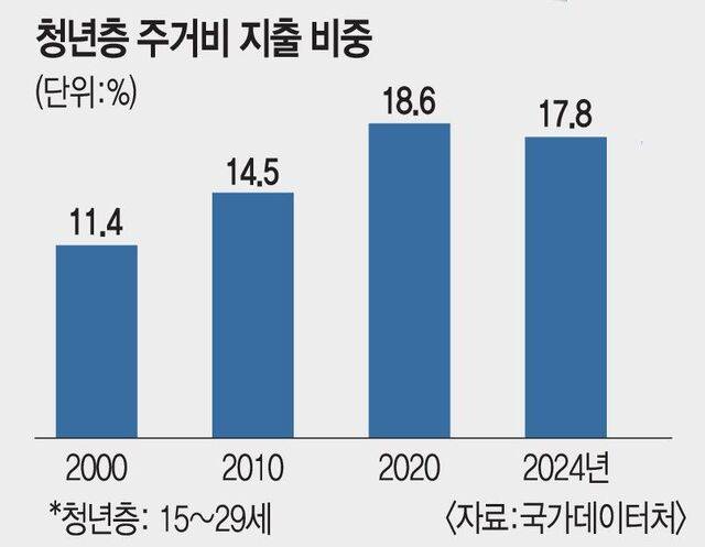 젊은층 주거의 질 또한 하락하는 추세다. 학업과 취업을 계기로 독립하는 청년 대부분은 월세 형태로 거주하는데, 공급이 수요를 따라가지 못하면서 월세가 가파르게 오르고 있기 때문이다. 청년층 주거비 지출 비중은 2010년 14.5%에서 2024년 17.8%로 많아졌다. 이에 따라 고시원 등 취약 거처를 이용하는 청년 비중은 2010년 5.6%에서 2023년 11.5%로 뛰었다. 최소 주거기준(14㎡)에도 못 미치는 주거 비중 역시 2023년 6.1%에서 2024년 8.2%로 커졌다.