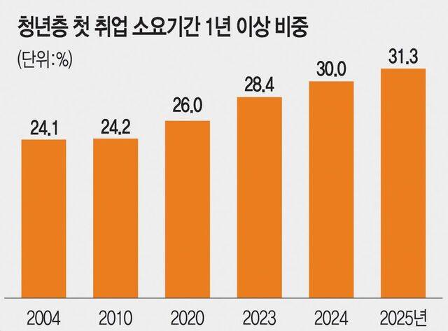 겉으로 보이는 고용 지표는 개선 흐름을 보이고 있다. 청년층 고용률은 2000년 43.4%에서 2024년 46.1%로 올랐고, 실업률은 같은 기간 8.1%에서 5.9%로 하락했다. 하지만 청년의 노동시장 진입 초기 단계에선 이런 지표와는 전혀 다른 양상이 빚어지고 있다. 2004~2013년 입사한 청년들이 첫 취업에 들인 시간은 평균 18개월이었다. 이후 10년(2014~2023년) 동안엔 취업에 성공하기까지 22개월이 소요됐다. 졸업과 동시에 취업하는 청년 비율도 같은 기간 17.9%에서 10.4%로 하락했다. 높아진 취업문에 구직을 포기하고 그냥 ‘쉬었음’이라고 답한 청년은 2003년 22만7000명에서 2024년 42만2000명으로 배 가까이 늘었다.
