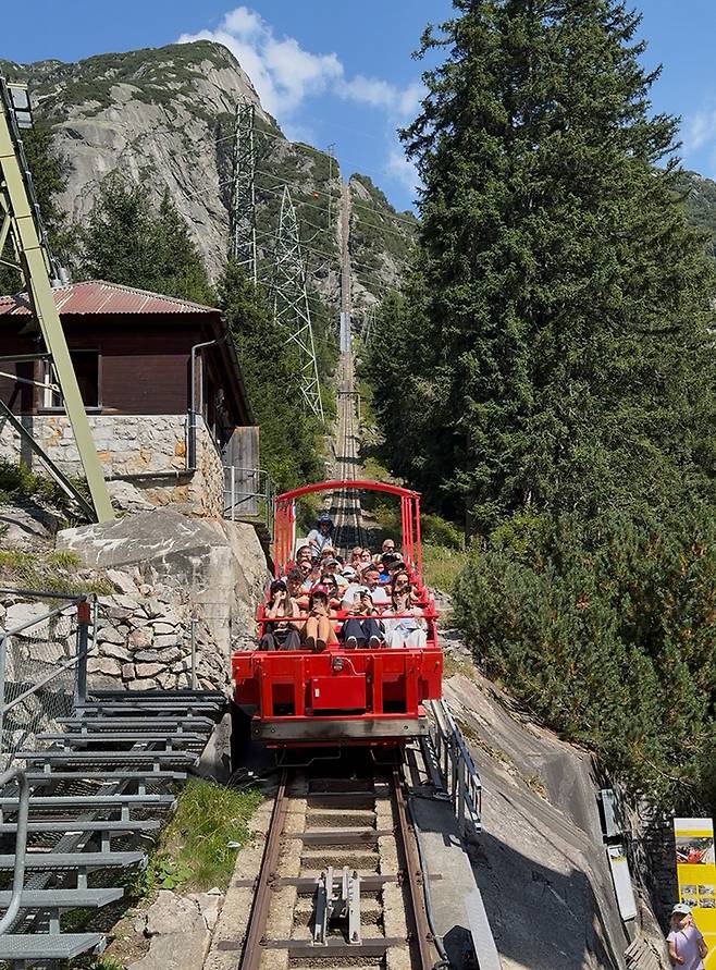 최대 경사 106°를 기록하는 겔머반(Gelmerbahn)은 유럽에서 손에 꼽히는 가파른 산악열차다. 수직에 가까운 경사로 해발 1,860m에 자리한 겔머 호수를 오간다. 겁이 많다면 뒷자리를, 전망이 중요하다면 앞자리를 추천한다. 한덱(Handegg)을 반환점으로 편도 12분, 왕복 24분이며, 한 번에 24명의 승객이 탑승할 수 있다. 선로가 하나뿐이라 30분 간격으로 운행한다.