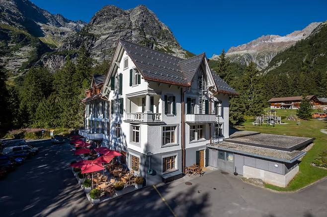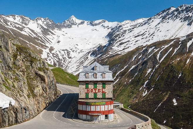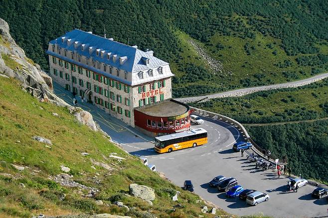 푸르카패스를 달리다 보면 가파른 산비탈과 론 빙하 사이 자리한 호텔을 만나게 된다. 스위스 전역에서 한창 호텔 개발이 활발했던 19세기에 지어진 것으로, 마차에서 내연기관차, 그리고 전기차까지 오갔다. 이동 수단의 역사를 품은 호텔인 셈이다.