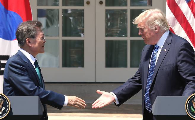 | ▲ 2017년 6월 30일 오전(현지시간) 문재인 대통령과 도널드 트럼프 미국 대통령이 워싱턴 백악관에서 정상회담을 마친 뒤 열린 공동기자회견에서 악수를 하고 있다. |