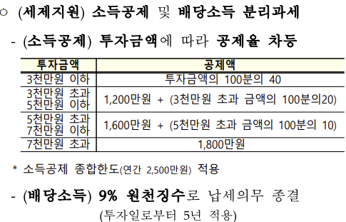 이와 함께 투자한 날로부터 5년간 배당받은 금액은 분리과세돼 9% 세율이 적용됩니다. 소득세에 추가로 과세되는 농어촌특별세도 비과세로 적용됩니다.