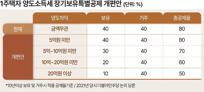 현재 1가구 1주택자는 보유·거주 기간별로 최소 24%에서 최대 80% 장기보유특별공제를 받을 수 있다. 보유·거주기간이 3년 이상이면 각각 12% 공제를 받고, 10년 이상이면 각각 최대 40%, 총 80% 공제율을 적용받는다. 지난 2021년 민주당 부동산특별위원회가 거주기간 최대 공제율은 기존 40%를 유지하되 보유기간 공제율을 양도차익에 따라 ▷5억 미만 40% ▷10억 미만 30% ▷20억 미만 20% ▷20억 이상 10%로 축소하는 안을 추진했다가, 대선 국면에서 표심을 고려해 실제 개편으로 이어지진 않았다.