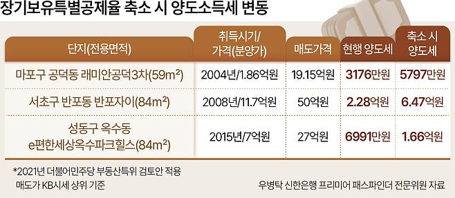마포구 공덕동 ‘래미안공덕3차’ 59㎡를 2004년 1억8600만원에 분양받은 1주택 소유주가 19억1500만원에 매도한다고 가정하면 양도세는 3176만원에서 5797만원으로 2배 가까이 늘어난다. 성동구 옥수동 ‘e편한세상옥수파크힐스’ 84㎡를 2015년 7억원에 분양받아 10년간 보유 및 거주한 뒤 현재 시세인 27억원에 팔았다면 양도세는 6991만원에서 1억6592만원으로 증가한다.