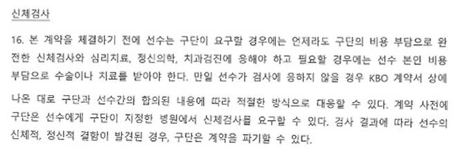이 계약 합의서의 16조에는 "계약 사전에 구단은 선수에게 구단이 지정한 병원에서 신체검사를 요구할 수 있다. 검사 결과에 따라 선수의 신체적 정신적 결함이 발견된 경우, 구단은 계약을 파기할 수 있다"고 명시돼 있습니다.
