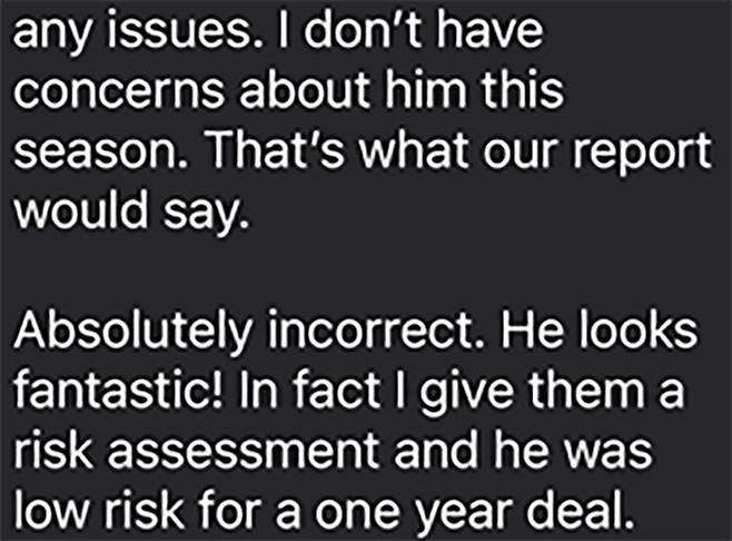 실제로 당시 신체검사를 맡았던 병원의 담당 의사가 이후에 버하겐 측에 보낸 문자 메시지에는 "버하겐에게 어떤 걱정도 없다. 그 내용이 소견서에 들어갈 것이다. 버하겐은 환상적이다! 1년 계약에 부상 리스크는 적다고 생각한다"라고 적혀 있었습니다.