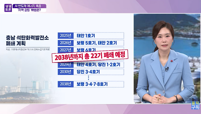 네 그렇군요. 이 반도체와 AI로 전력 수요가 늘어나는 만큼 기후위기의 심각성은 커지고 있습니다. 때문에 탄소 배출원으로 꼽히는 전력원인 석탄을 줄이는 선택을 하고 있는데요. 지난해 연말 태안 석탄화력 1호기가 30년 만에 발전을 종료했고요. 정부는 이를 에너지 전환의 시작이다 이렇게 설명하고 있습니다. 태안 1호기를 시작으로 2040년까지 충남에서만 22기 전국적으로 모두 40기가 단계적으로 운영을 중단하게 됩니다. 이번 1호기 폐쇄가 갖는 의미는 어떤 건지도 질문드려보겠습니다. 먼저 지역에서 이렇게 석탄화력발전소가 폐쇄된 이후에 삶의 터전을 잃은 노동자들이 많을 텐데요. 어떻게 보고 계신지 말씀해 주시죠.
