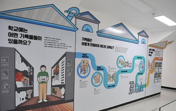 | ▲ 주제별 전시 장소로도 활용될 기록원 1층 아카이브월. 기록원 곳곳에 옛 교정의 추억을 돋게 하는 장면들이 묘사돼 있다. |