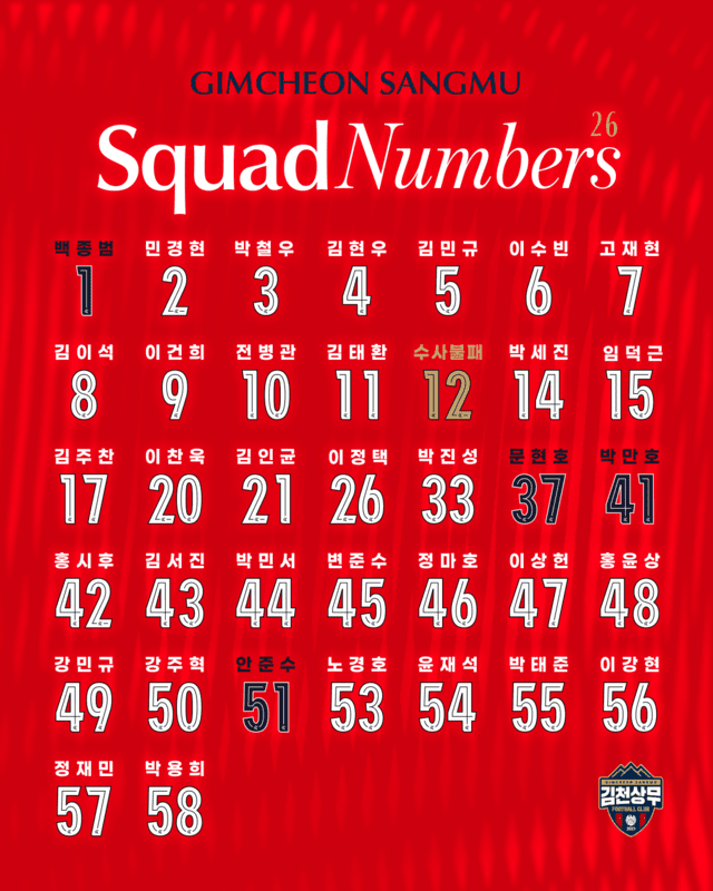 K리그1에서 마지막 시즌을 준비하는 김천 상무가 2026시즌 프로선수단 배번을 확정, 공개했다.