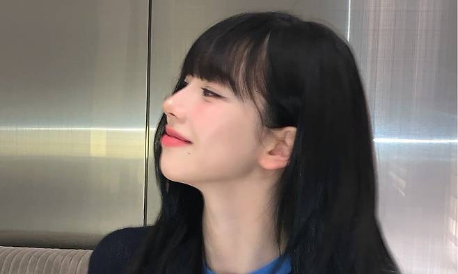 사진 속 카리나는 블루 포인트가 더해진 그레이 니트를 입고 차분한 분위기를 연출했다.