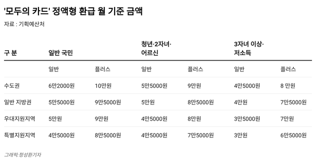 정부는 그동안 대중교통 혜택이 수도권에 집중됐다는 지적을 반영해 비수도권과 취약계층 지원을 강화했다. 지방 혜택을 늘리고자 수도권과 일반 지방권, 우대지원지역, 특별지원지역으로 구분해 환급 월 기준 금액을 다르게 둔다. 지방권과 인구감소지역은 환급 월 기준 금액이 낮다. 가령 지방·인구감소지역 저소득 가구는 수도권 일반 이용자 기준(월 6만2000원)의 절반 이하인 3만원 수준으로 대중교통을 이용할 수 있다.