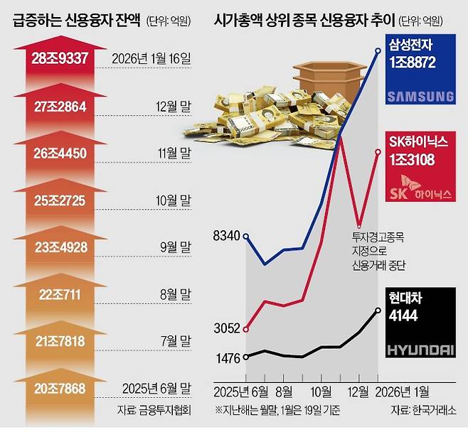최근 6개월 동안 급등한 대형주를 중심으로 빚투 열기가 뜨겁다. 올 들어 20% 넘게 주가가 뛴 삼성전자의 19일 기준(결제일) 신용잔액은 1조8872억원이다. 지난해 6월 말 8340억원 대비 126% 급증했다. 로봇 기업으로 재평가받기 시작한 현대차의 신용잔액도 이달 급증하고 있다. 작년 말 기준 2857억원이던 신용잔액은 2주 만에 45% 불어난 4144억원으로 집계됐다. 작년 말 투자경고종목 지정으로 신용거래가 중단됐던 SK하이닉스의 신용잔액도 1조원대를 회복했다. 지난해 11월 1조4000억원대로 치솟았던 SK하이닉스 신용잔액은 같은 해 12월 투자경고종목 지정에 8841억원까지 급감하더니 이달 19일 1조3108억원을 기록했다.