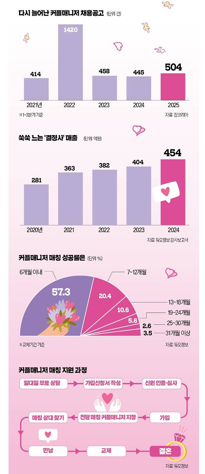 커플매니저의 역할이 단순한 ‘조건 맞추기’에서 ‘삶의 결합’이란 의미로 확장한 만큼 인공지능(AI) 기반 매칭 솔루션에만 의존할 수도 없다. 이전만 해도 의사, 변호사, 교사 등 선호도가 높던 직업군은 ‘상위 등급’으로 구분됐지만 요즘에는 상대를 종합적으로 보고 판단하려는 경향이 강해져서다. 전 매니저는 “몇 시간에 달하는 상담을 통해 어떤 삶을 살아왔는지 이야기를 듣고 어울리는 사람을 찾기 위해 고심한다”고 했다. 커플매니저 수요는 결혼정보업체의 매출로도 설명된다. 듀오정보는 최근 5년간 연 매출이 281억원에서 454억원으로 뛰었고, 가연은 최소 2년간 매출이 매년 10% 늘었다.