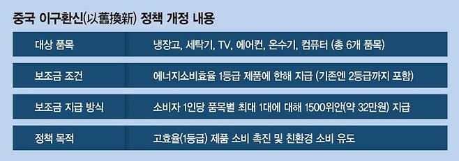 20일 업계에 따르면, 중국 정부는 냉장고·세탁기·TV·에어컨·온수기·컴퓨터 등 6개 품목에 대해 에너지소비효율 1등급 제품에만 보조금을 지급하는 내용으로 '이구환신(以舊換新)' 정책을 개정해 올해부터 시행에 들어갔다. 기존에는 에너지효율 2등급 제품까지 지원 대상에 포함됐지만 이번 개정으로 범위를 1등급에 한정하면서 고효율 제품 소비를 유도하려는 전략으로 해석된다. 개정된 정책에 따라 소비자는 품목당 최대 1개 제품에 한해 1500위안(한화 약 32만원)의 보조금을 받을 수 있다. 즉 저가 제품에는 부담이 될 수 있지만 에너지 고효율 프리미엄 제품을 앞세운 글로벌 브랜드에는 오히려 기회 요인이 될 수 있다는 의미다.