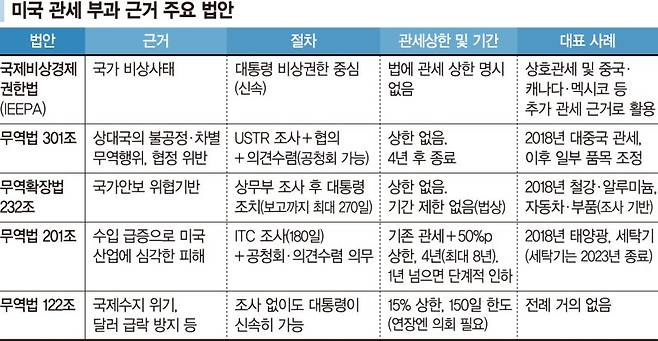 트럼프 행정부가 염두에 둔 대안은 △무역법 301조 △무역확장법 232조 △무역법 122조 △스무트-홀리 관세법 338조 등이다.