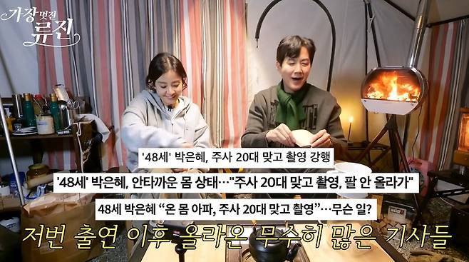 [TV리포트=김도현 기자] 배우 박은혜가 주사 20대 발언 이후 불거진 건강 이상설에 대해 정면 반박에 나섰다. 20일 채널 '가장(멋진)류진'에는 '아내 몰래 여사친 캠핑장 가서 밥 얻어먹기'라는 제목의 영상이 게시됐다.