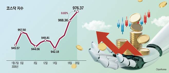 20일 한국거래소에 따르면 코스닥 지수는 전 거래일 대비 8.01포인트(0.83%) 오른 976.37에 거래를 마감했다. 지수는 장중 985.79를 찍으며 52주 신고가를 기록했다. 이는 지난 2022년 1월 13일(983.25포인트) 이후 4년 만에 980선을 넘어선 것이다. 종가 기준 970선을 넘어선 것도 2022년 1월 14일(971.39) 이후 처음이다.