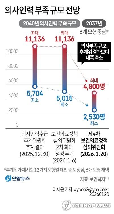 (서울=연합뉴스) 이재윤 기자 = 정부가 2037년에 부족한 의사 수가 2천500여명에서 4천800명 사이일 것으로 보고 의과대학 정원 증원 논의를 이어가기로 했다.