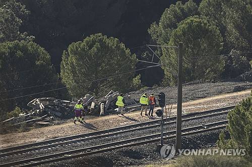 epa12663756 Workers look at the train tracks in Adamuz, Cordoba, Spain, on 20 January 2026, at the site of the crash between two high-speed train sets that occurred on 18 January 2026. At least 41 people were killed after a high-speed train carrying more than 300 passengers derailed and struck an oncoming train on the adjacent track. Emergency services remain on the scene as recovery efforts continue. EPA/Jorge Zapata