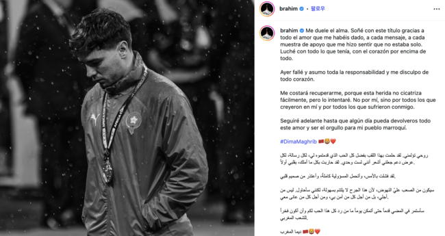 이어 “다시 일어나는 데는 시간이 필요할 것이다. 이 상처는 쉽게 낫지 않는다. 그래도 나를 믿어준 사람들과 함께 아파했던 이들을 위해 앞으로 나아가겠다”며 “언젠가 이 사랑을 되돌려주고 모로코 국민의 자랑이 될 때까지 멈추지 않겠다”고 밝혔다.