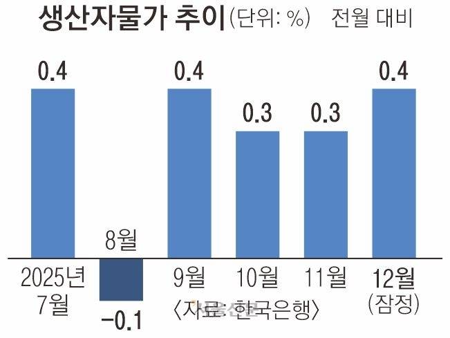 20일 한국은행에 따르면 지난해 12월 생산자물가지수는 121.76으로 전월보다 0.4% 올랐다. 지난해 9월 이후 넉 달 연속 상승이다. 생산자물가는 기업이 물건을 만드는 단계에서의 가격 흐름을 보여주는 지표로, 오름세가 이어지면 시차를 두고 소비자물가에도 영향을 준다.