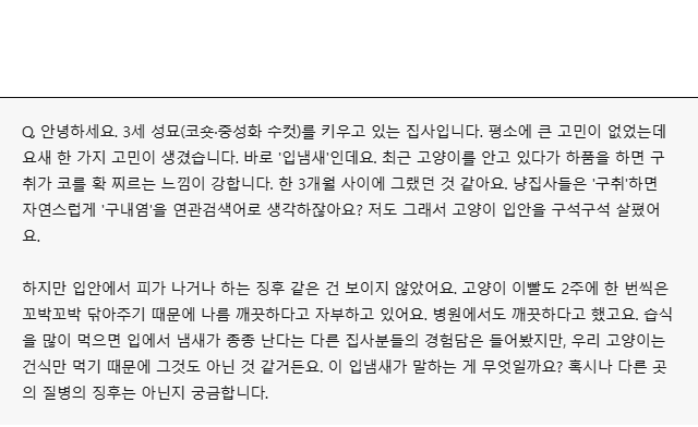 안녕하세요. 24시 센트럴 동물메디컬센터 원장이자 '24시간 고양이 육아대백과'를 쓴 김효진 수의사입니다. 오늘은 고양이의 구취 때문에 걱정이 되신 집사님이 사연을 보내주셨는데요. 어느날 갑자기 느낀 고양이의 구취, 과연 괜찮은 걸까요? 이번에는 구취의 근본적인 원인부터 절대 놓쳐서는 안 될 위험 신호인 '4대 질환'까지 꼼꼼하게 짚어드리겠습니다.