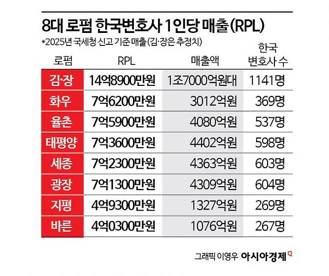 대형 로펌들의 지난해 실적이 공개되면서 '한국변호사 1인당 매출액(RPL)' 경쟁도 본격화되는 분위기다.