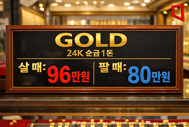 금 거래에서 가장 큰 오해는 같은 금인데도 살 때와 팔 때 가격이 크게 다르다는 점이다. 이달 중순 기준 주요 금 거래소의 시세를 보면, 24K 순금 한 돈을 살 때 가격은 약 96만~97만 원 수준이지만 팔 때는 80만 원대 초반에 형성돼 있다. 같은 금이라도 매수·매도에 따라 16만 원 이상 차이가 난다.