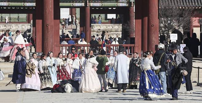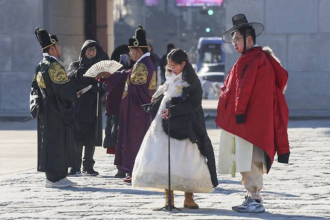 서울 전역에 한파주의보가 내려진 21일 서울 종로구 경복궁에서 외국인 관광객들이 외투를 벗어 놓고 기념사진을 찍고 있다.