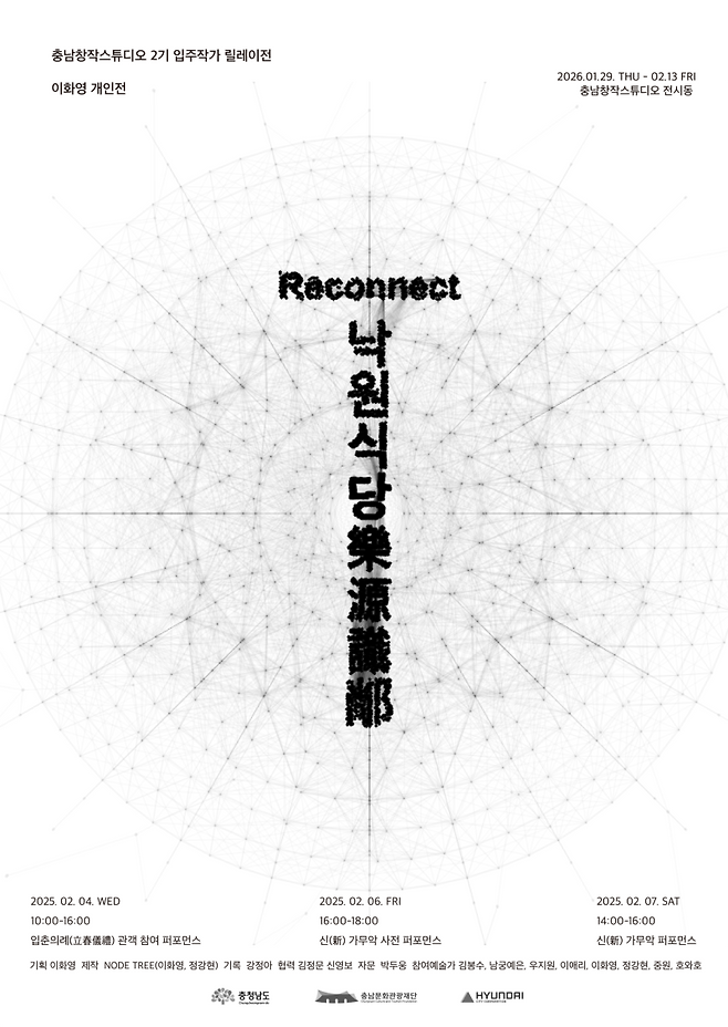 또한 이번 전시는 충남 고유의 문화 자산인 ‘중고제 가무악’을 현대적으로 재해석한 퍼포먼스 〈Moment of Reconnect〉를 운영한다. 월요일은 휴관이며, 화요일부터 일요일 오전 10시부터 오후 6시까지 무료로 관람할 수 있다.
