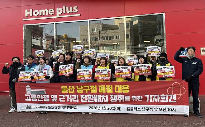 노조와 홈플러스살리기 울산공동대책위는 20일 남구점 앞에서 기자회견을 열고 "실질적인 해고나 다름없는 원거리 발령 중단하라"며 "홈플러스는 근거리 배치를 약속하라"고 촉구했다. 이어 "기업회생절차 돌입 이후 공급망 붕괴, 임금 분할 지급, 심지어 단전 위기까지 겪으며 회사를 지켜온 것은 다름 아닌 현장의 노동자들이었다"며 사측을 비판했다.