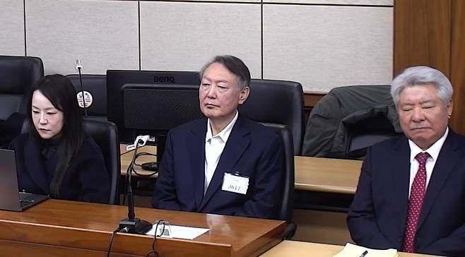 | ▲ 16일 오후 서울중앙지방법원 형사합의35부(재판장 백대현 부장판사)의 체포방해 사건 선고공판에서 윤석열씨가 변호인들과 함께 판결선고 내용을 듣고 있다. |